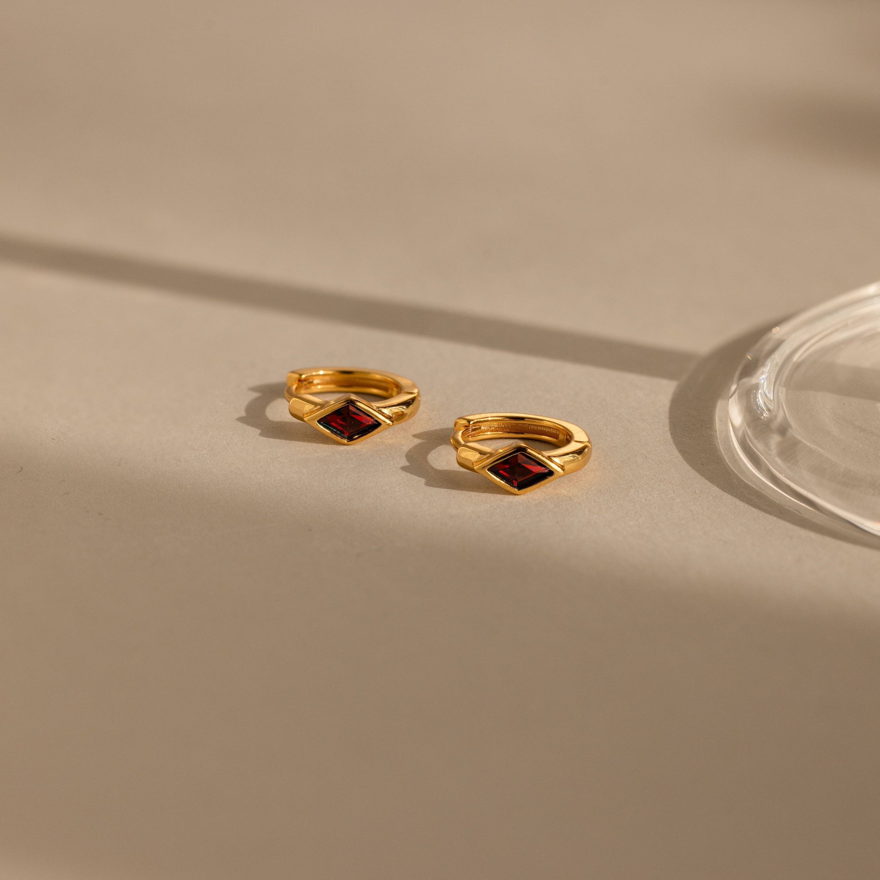 Add a touch of glimmer to your everyday look with our stunning Rhombus Birthstone Huggies! Featuring a sleek rhombus-shaped gemstone set on classic huggie hoops, these earrings are fully customizable with the stone of your choice, making them uniquely yours. Whether you__e dressing up or keeping it casual, this shimmering design effortlessly elevates any outfit.